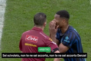 转播方:裁判跟邓弗里斯说他滑倒,安抚说国米还有10分钟去赢比赛