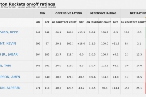 注:on-off值统计的是在场净效率与不在场净效率的差值,本次统计要求至少打200分钟。