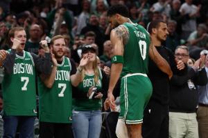 本场比赛,塔图姆出战27分钟,前6投全丢,但此后顶级调整连进四球连得9分,全场他16中6拿到15分12篮板7助攻1抢断,正负值+20!