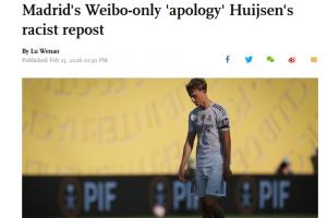 体育资讯02月23日讯 《环球时报》英文版网站发文报道了赫伊森转发辱华内容的事件,文章的标题为《中国球迷对皇马仅在微博发布的"道歉"表示不满,此前赫伊森转发种族歧视内容》。