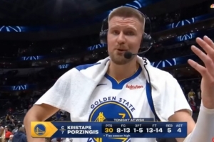 本场比赛,波尔津吉斯出战26分钟,13中8,14罚13中砍下勇士生涯新高的30分外加5板4助2断3帽。