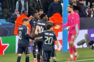 维尼修斯补时上演梅开二度后,对着球迷展示球衣。随后曼城门将多纳鲁马摊手与其沟通表达不满。
