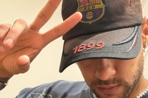 内马尔社媒晒出照片,他的衣服和帽子上都有巴萨队徽图案。