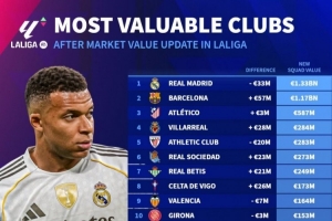 西甲球队德转身价变化:巴萨增加5700万欧,皇马下跌3300万欧