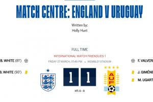 体育资讯03月28日讯 友谊赛英格兰1-1战平乌拉圭,乌加特出现2张黄牌没被罚下争议,但其实是转播失误。