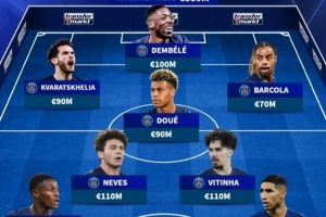 前锋:克瓦拉茨赫利亚(巴黎,9000万欧)、登贝莱(巴黎,1亿欧)、巴尔科拉(巴黎,7000万欧)