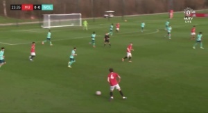 体育资讯02月21日讯 U18英超联赛,曼联U18对阵狼队U18。上半场比赛第24分钟,曼联15岁天才小将JJ·加布里埃尔打入一粒精彩的爆杆进球。