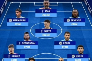 后卫:凯尔凯兹(利物浦,4700万)、格瓦迪奥尔(曼城,9000万)、范戴克(利物浦,8500万)、努内斯(曼城,6200万)