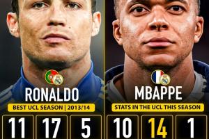 姆巴佩本赛季欧冠出战10场比赛已经打进14球,高居射手榜第一。而在欧冠单赛季总进球排行榜上,姆巴佩距离C罗在2013/14赛季的17球纪录还有3球之差。