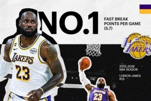 体育资讯4月16日讯 今日,湖人官推更新一张海报,祝贺球星詹姆斯本赛季常规赛场均快攻得分5.7分联盟第一。