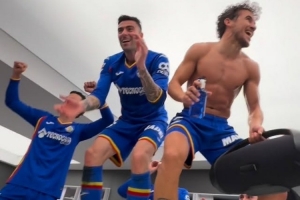 赫塔费时隔18年再次在伯纳乌球场战胜皇马,赛后赫塔费球员跳上更衣室的桌子,载歌载舞庆祝胜利。