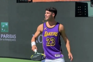 这是继此前备战澳大利亚网球公开赛时身穿詹姆斯球衣训练后,阿尔卡拉斯再次穿上詹姆斯球衣进行赛前训练。